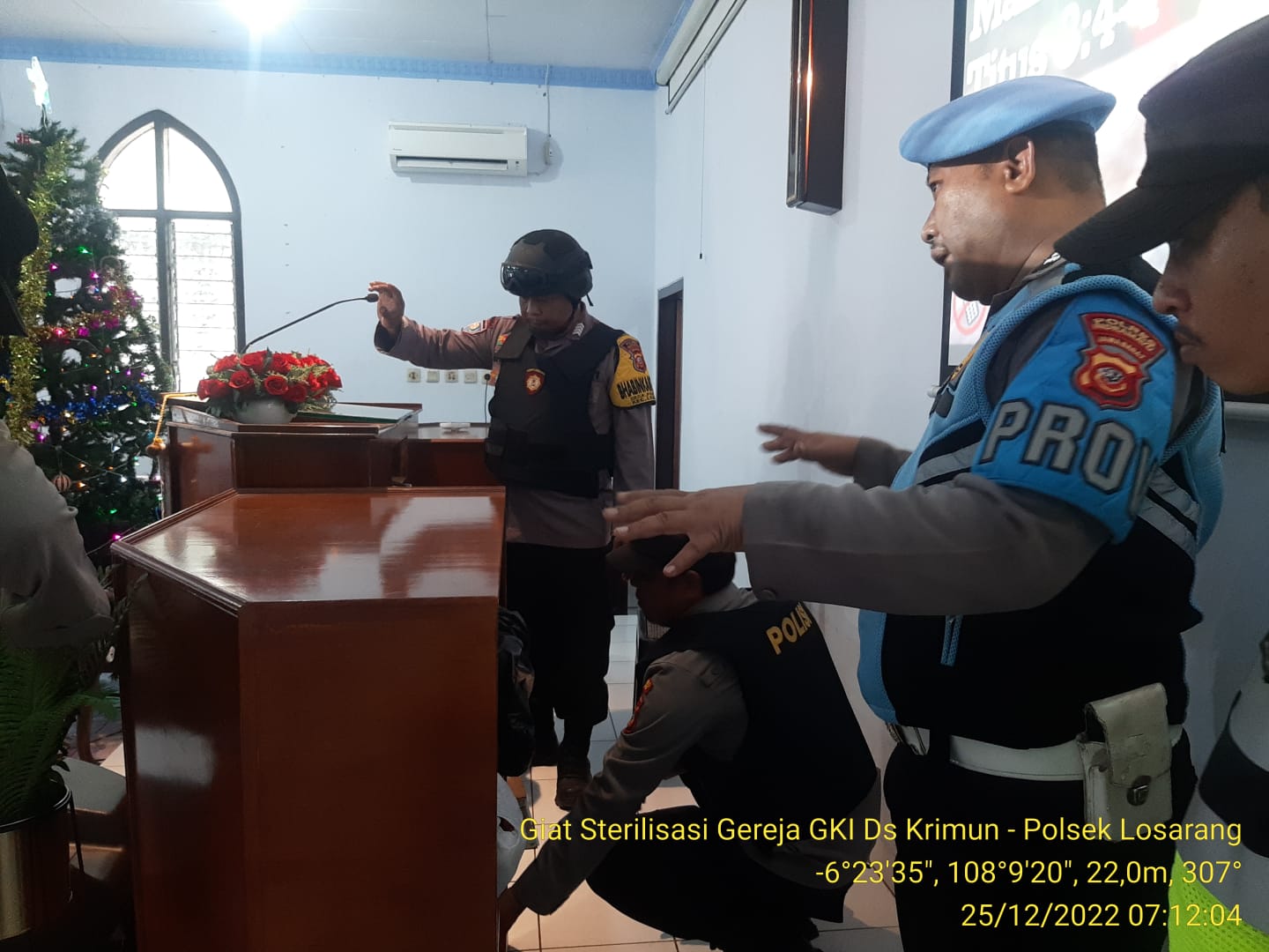 Indramayu,--- Polsek Losarang jajaran Polres Indramayu Polda Jabar bersama melaksanakan Sterilisasi Gereja GKI di Desa Krimun, Kecamatan Losarang, Kabupaten Indramayu, Minggu (25/12/22).